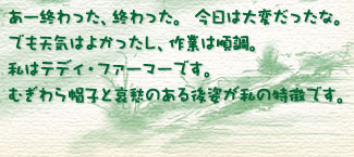 あー終わった,終わった.今日は大変だったな.でも天気はよかったし,作業は順調.私はテディファーマーです.むぎわら帽子と哀愁のある後姿が私の特徴です