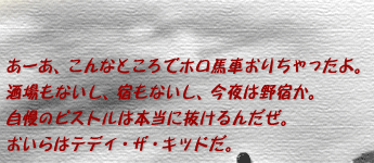 モ?ーあ,こんなところでホロ馬車おりちゃったよ.酒場もないし,宿もないし,今夜は野宿か.自慢のピストルは本当に抜けるんだぜ.おいらはテディザキッドだ