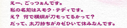 モ�ヲー,ごっつぁんです.私の名前はスモウテディです.え?何で横綱が刀もってるかって?だって,太刀持ちがカゼひいて休みなんです.